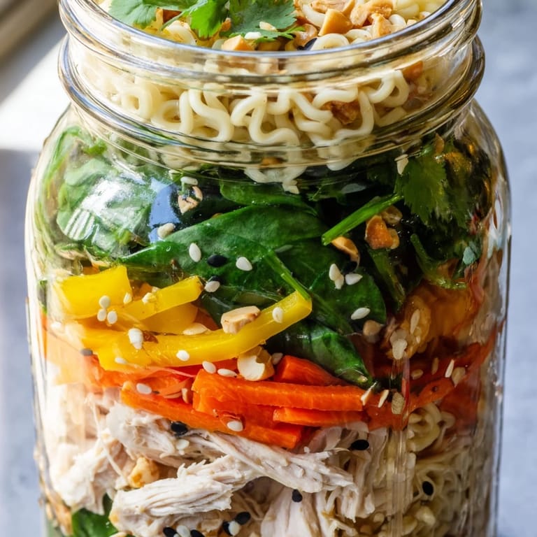 Pin It My coworker showed me her lunch one Tuesday, and I thought she'd brought a science project to the office. Layers of bright vegetables and noodles pressed against glass, everything visible like a tiny edible terrarium. She poured hot water in, gave it a shake, and five minutes later was twirling perfect noodles while I ate my sad sandwich. I bought mason jars that weekend.